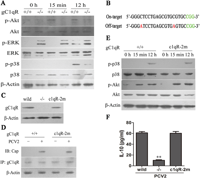 Figure 8: PCV2 binding with gC1QR to activate PI3K/Akt and P38 MAPK. A. Western blot analysis of the phosphorylation levels of Akt, ERK1/2 and p38 MAPK in wild-type and gC1QR-/- cells inoculated with PCV2 for indicated times. B. Mutated gRNA (gRNA-c1qR-2m) sequences for off-targeting gC1QR locus and corresponding protospacer adjacent motifs (PAM). Red bases: mutations; green bases: PAM. C. Western blotting analysis of gC1QR expression in the cells infected lentivirus containing gRNA-c1qR-2 or gRNA-c1qR-2m as well as wild-type cells. D. Immunoprecipitation analysis of the interaction of Cap with gC1QR in wild-type cells and the cells infected lentivirus containing gRNA-c1qR-2m after PCV2 inoculation E. Western blot analysis of Akt phosphorylation in gRNA-c1qR-2m lentivirus infected cells and wild-type cells after PCV2 inoculation. F. ELISA detection of PCV2-induced IL-10 production in wild-type cells, gRNA-c1qR-2 lentivirus-infected cells and gRNA-c1qR-2m lentivirus-infected cells (1×106 cells). The data shown are representative of three independent experiments. The results are mean ± SEM of 3 independent experiments. **P < 0.01 versus PCV2-inoculated wild-type cells.
