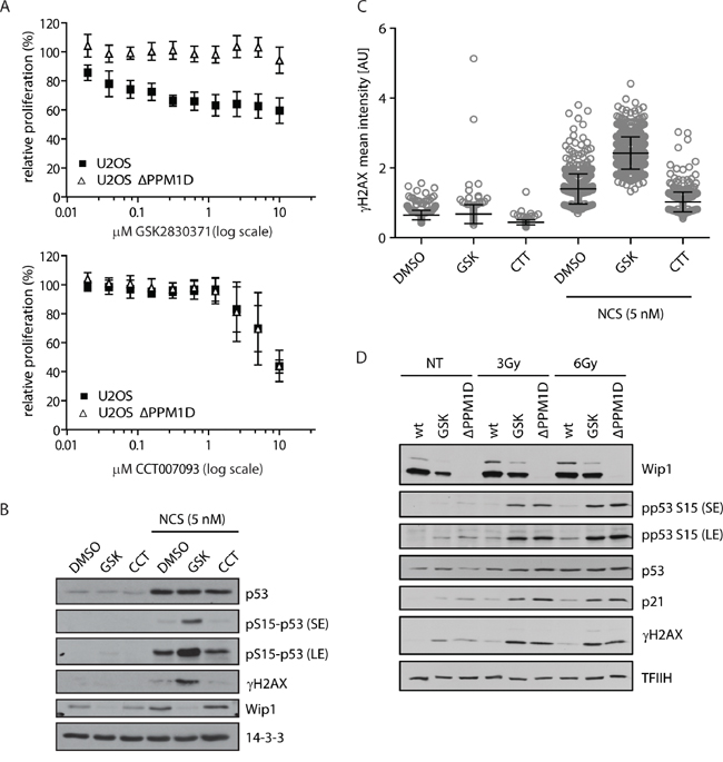 Figure 1: Validation of WIP1 inhibitors in U2OS-PPM1D-KO cells. A. U2OS or U2OS-PPM1D-KO cells were treated with DMSO, CCT007093 or GSK2830371 at indicated doses and relative cell proliferation was measured after 7 days. Error bars represent SD. B, C. U2OS cells were treated with DMSO, CCT007093 (10 μM, CCT) or GSK2830371 (0.5 μM, GSK) and DNA damage was induced by 5 nM neocarzinostatin (NCS) for 5 h. Cells were analyzed by immunoblotting (B) or fixed and nuclear γH2AX intensity was determined by immunofluorescent staining and microscopy analysis C. Dots represent individual cells. Error bars represent SD. D. U2OS or U2OS-PPM1D-KO (ΔPPM1D) cells were treated with DMSO or GSK2830371 (0.5 μM), exposed to ionizing radiation (3 and 6 Gy) and analysed by immunoblotting using indicated antibodies. Short exposure (SE) or long exposure (LE) is shown.