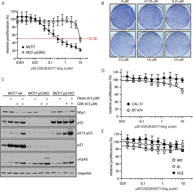 Figure 2: Inhibition of WIP1 impairs proliferation of cancer cells with amplified PPM1D. A. MCF7 or MCF7-P53-KO cells were treated with indicated doses of GSK2830371 and relative cell proliferation was measured after 7 days. Error bars represent SD. B. MCF7 cells were treated with indicated doses of GSK2830371 and cell proliferation was determined by colony formation assay after 7 days. Representative image from three independent experiments is shown. C. MCF7, MCF7-P53-KO or MCF7-P21-KO cells were treated with DMSO, GSK2830371 (0.5 μM), doxorubicin (0.5 μM) or combination of both and cells were analyzed by immunoblotting after 24 h. D. BT-474 or CAL-51 cells were treated with indicated doses of GSK2830371 and relative cell proliferation was measured after 7 days. Error bars represent SD. E. BJ fibroblasts, hTERT-RPE1 cells or human colon epithelia cells (HCE) were treated with indicated doses of GSK2830371 and relative cell proliferation was measured after 7 days. Error bars represent SD.