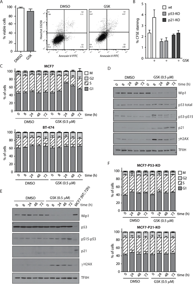 Figure 3: WIP1 inhibition leads to G1 and G2 phase accumulation in MCF7 cells. A. MCF7 cells were treated with DMSO or GSK2830371 (0.5 μM) for 5 days and percentage of living cells (Hoechst/Annexin V negative) was determined by flow cytometry. Error bars represent SD. B. MCF7, MCF7-P53-KO or MCF7-P21-KO cells were incubated with CFSE and subsequently treated with DMSO or GSK2830371 (0.5 μM) for 3 days. Fluorescent signal of CFSE was measured by flow cytometry. Plotted is the CFSE signal relative to the signal measured at day 0. Error bars represent SD. C. MCF7 or BT-474 cells were treated with DMSO or GSK2830371 (0.5 μM) for indicated times, pulsed with BrdU before fixation and distribution of cell cycle phases was determined by flow cytometry. BrdU incorporation was used as a marker of replication and pS10-H3 as a marker of mitotic cells. Error bars represent SD. D. MCF7 cells were treated as in C and analyzed by immunoblotting. E. BT-474 cells were treated as in C and analyzed by immunoblotting. F. MCF7-P53-KO or MCF7-P21-KO cells were treated with DMSO or GSK2830371 (0.5 μM) for indicated times, pulsed with BrdU before fixation and distribution of cell cycle phases was determined as in C. Error bars represent SD.