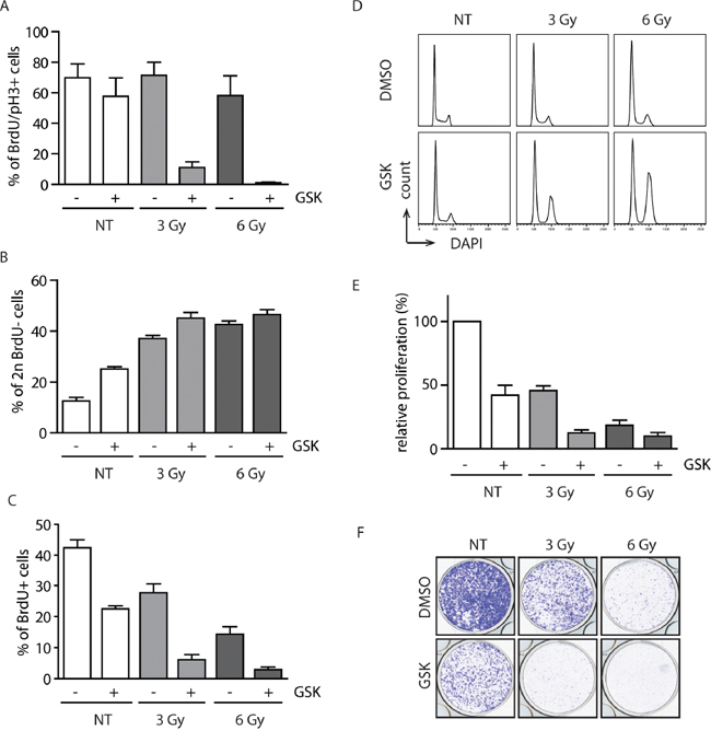 Evaluation of the cell cycle checkpoints was performed as described previously with minor modifications [39]. Cells were pulsed with BrdU (10 μM for 30 min) and treated with GSK2830371 (0.5 μM) or DMSO before irradiation with 3 or 6 Gy and were grown for further 20 h in the presence of nocodazole (250 ng/ml). Cells were processed as mentioned above and analyzed by flow cytometry. BrdU-positive cells were assayed for progression through the G2 phase to mitosis (4n DNA content, pH3+). BrdU-negative cells with 2n content were used for quantification of cells arrested in G1 checkpoint.