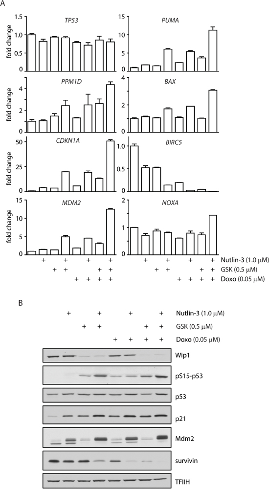 To quantify activation of the p53 pathway after treatment of MCF7 cells with combination of WIP1 inhibitor and chemotherapeutics we analyzed the expression profiles of selected established p53 target genes. As expected, expression of CDKN1A increased 3-5 fold after treatment with GSK2830371, nutlin-3 or doxorubicin administered individually (Figure 6A). Double combination of GSK2830371 with nutlin-3 or doxorubicin resulted in approximately 20 fold increase in CDKN1 expression. The highest induction of CDKN1A expression (about 50 fold) was observed after triple combination of GSK2830371, nutlin-3 and doxorubicin. Similarly, expression of p53 up-regulated modulator of apoptosis (PUMA) or pro-apoptotic regulator BAX showed the strongest induction after triple combination of GSK2830371, nutlin-3 and doxorubicin. In contrast, we did not observe any significant change in expression of an apoptosis-promoting gene NOXA. Inversely, we observed a strongly reduced expression of BIRC5 (coding for survivin), an anti-apoptotic gene that was reported to be suppressed in a p53-dependent manner [69, 70]. In addition, we have found strongly increased expression of PPM1D and MDM2 after triple combination of GSK2830371, nutlin-3 and doxorubicin, which is consistent with the described transcriptional regulation of both genes by p53. Although expression of PPM1D mRNA was increased after triple combination of the drugs, protein levels of WIP1 were decreased (Figure 6B) due to the destabilization of WIP1 caused by binding of GSK2830371 to its catalytic domain [63]. After 3 days of GSK2830371 treatment we did not observe increased total levels of p53; however p53 was heavily phosphorylated at Ser15 known to stimulate its transcriptional activity [11].