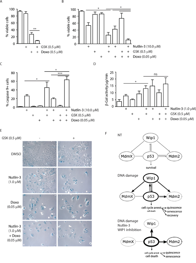 Figure 7: Inhibition of WIP1 potentiates induction of senescence or apoptosis. A. MCF7 cells were incubated with GSK2830371 (0.5 μM) and doxorubicin (0.5 μM) for 3 days and fraction of viable cells (Hoechst/Annexin V negative) was determined by flow cytometry. Error bars represent SD. B. MCF7 cells were incubated with indicated combinations of GSK2830371 (0.5 μM), nutlin-3 (10.0 μM) and doxorubicin (0.05 μM) for 3 days and fraction of viable cells (Hoechst/Annexin V negative) was determined by flow cytometry. Error bars represent SD. C. MCF7 cells were treated as in (B) and fraction of cells with active caspase 9 was determined by flow cytometry. Error bars represent SD. D. MCF7 cells were incubated with indicated combinations of GSK2830371, nutlin-3 (1.0 μM) and doxorubicin (0.05 μM) for 7 days. Activity of SA-β-galactosidase was measured in cell extracts using fluorimetric assay. Error bars represent SD. E. MCF7 cells were incubated as in D and SA-β-galactosidase activity was evaluated by light microscopy. F. Model for outcomes of treatment with p53/mdm2/Wip1 pathway modulators. Under non-treated conditions, p53 activity is tightly controlled by MDM2 and MDMX. Upon mild DNA damage, MDM2 is inhibited and destabilized leading to stabilization of p53 that in turn leads to increased transcription of its targets including WIP1 phosphatase. Subsequently WIP1 inactivates p53 pathway by direct dephosphorylation of p53 Ser15 and through activation of MDM2 and possibly also MDMX by their dephosphorylation. When MDM2-p53 interaction inhibitor nutlin-3 and WIP1 inhibitor are combined with DNA damage, MDM2 cannot ubiquitinate and thus degrade p53 and WIP1 cannot oppose activation of p53. This leads to further increase of p53 protein levels and its phosphorylation at Ser15 and results mainly in cell death. Thickness of the circle lines represents protein levels; dashed lines mean inhibition of the protein activity.