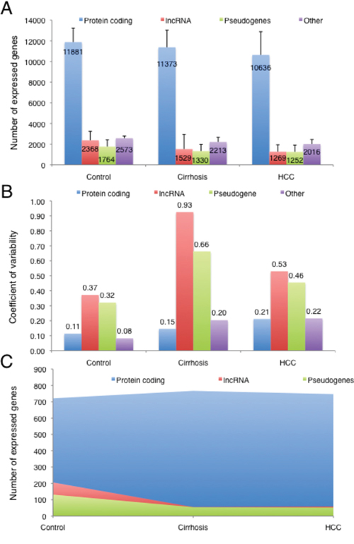 Figure 1: A. Number of genes expressed in control livers (3 cases), cirrhotic livers adjacent to HCCs and HCCs (10 cases) for each different gene category. B. Expression variability of each gene category in control livers, cirrhotic livers adjacent to HCCs and HCCs. C. Uniquely expressed genes for each category in control livers, cirrhotic livers adjacent to HCCs and HCCs.