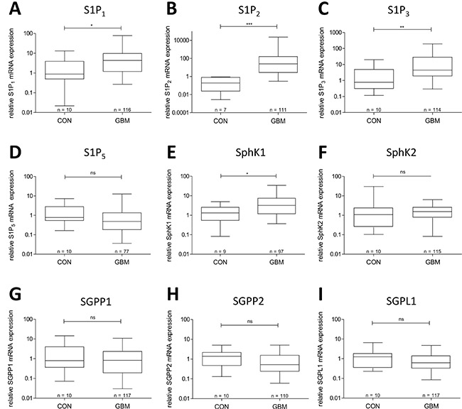 Figure 1: mRNA expression of S1P receptors and S1P metabolizing enzymes in glioblastoma tissue in comparison to non-malignant brain. (A) S1P1 mRNA expression, (B) S1P2 mRNA expression, (C) S1P3 mRNA expression, (D) S1P5 mRNA expression, (E) SphK1 mRNA expression, (F) SphK2 mRNA expression, (G) SGPP1 mRNA expression, (H) SGPP2 mRNA expression, (I) SGPL1 mRNA expression. mRNA expression levels in frontal/temporal lobes of non-neoplastic brains (CON) and glioblastoma patient´s samples (GBM) were analyzed by quantitative RT-PCR with normalization to 18S rRNA in relation to the median of CON. Data are shown as box plots representing the median as horizontal bars as well as the 5th and 95th percentile. Mann Whitney U test, ns = not significant, *p < 0.05, **p < 0.005 and ***p < 0.001.