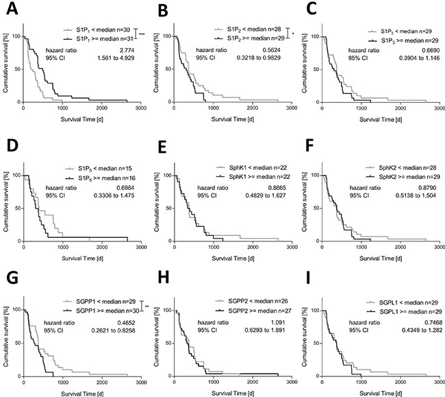Figure 2: Association between mRNA expression of S1P receptors and S1P metabolizing enzymes and survival time of patients with glioblastoma multiforme. Kaplan-Meier survival curves for patients with glioblastoma multiforme based on their (A) S1P1 mRNA expression, (B) S1P2 mRNA expression, (C) S1P3 mRNA expression, (D) S1P5 mRNA expression, (E) SphK1 mRNA expression, (F) SphK2 mRNA expression, (G) SGPP1 mRNA expression, (H) SGPP2 mRNA expression and (I) SGPL1 mRNA expression. Patients were divided into two subgroups depending on the respective median gene expression as determined by quantitative RT-PCR. Calculation of Hazard Ratios (< Median vs. > = Median expression), Log-rank (Mantel-Cox) test, *p < 0.05, **p < 0.005 and ***p < 0.001.