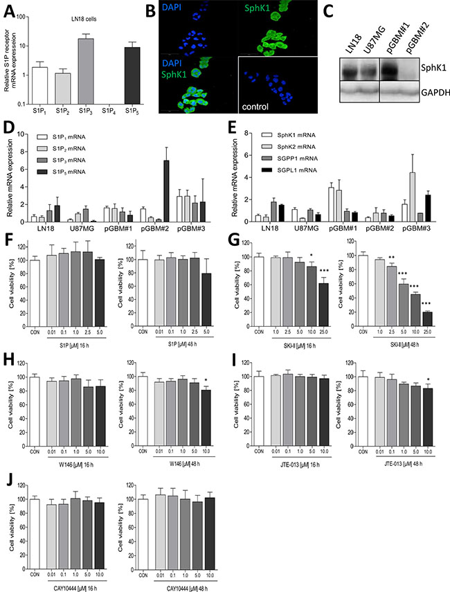 Figure 3: Analysis of the expression of S1P receptors as well as of S1P metabolizing enzymes and influence of its pharmacological blocking on cell viability of LN18 GBM cells. (A) Relative mRNA expression of S1P receptors S1P1, S1P2, S1P3, S1P4 and S1P5 in the human LN18 GBM cell line determined by quantitative RT-PCR. (B) Immunofluorescence staining of the SphK1 in the human LN18 GBM cell line. The control (bottom right corner) represents LN18 cells stained only with the secondary AlexaFluor 488 coupled antibody without prior incubation with the primary anti-SphK1 antibody. (C) Immunoblot analysis of SphK1 protein expression in the human GBM cell lines LN18 and U87MG as well as in primary GBM cells (pGBM) isolated from fresh tumor samples. (D + E) Quantitative RT-PCR of (D) S1P receptors and (E) S1P metabolizing enzymes in the human GBM cell lines LN18 and U87MG as well as in primary GBM cells (pGBM) isolated from fresh tumor samples. (F–J). Determination of LN18 cell viability by using the resazurine assay after treatment with (C) S1P (0.01, 0.1, 1, 2.5 and 5 μM), (D) sphingosine kinase inhibitor SKI-II (1, 2.5,10 and 25 μM), (E) the S1P1 receptor antagonist W146 (0.01, 0.1, 1, 5 and 10 μM), (F) the S1P2 receptor antagonist JTE-013 (0.01, 0.1, 1, 5 and 10 μM) or (G) the S1P3 receptor antagonist CAY10444 (0.01, 0.1, 1, 5 and 10 μM) for 16 (left panel) or 48 h (right panel). Control cells (CON) were treated with the respective solvent (MeOH for S1P, DMSO for all inhibitors). Cell viability is shown in relation to the control (100%), mean values and SD, n = 3, One-way analysis of variance with Dunnett´s multiple comparison test, *p < 0.05, **p < 0.005 and ***p < 0.001 vs. control.