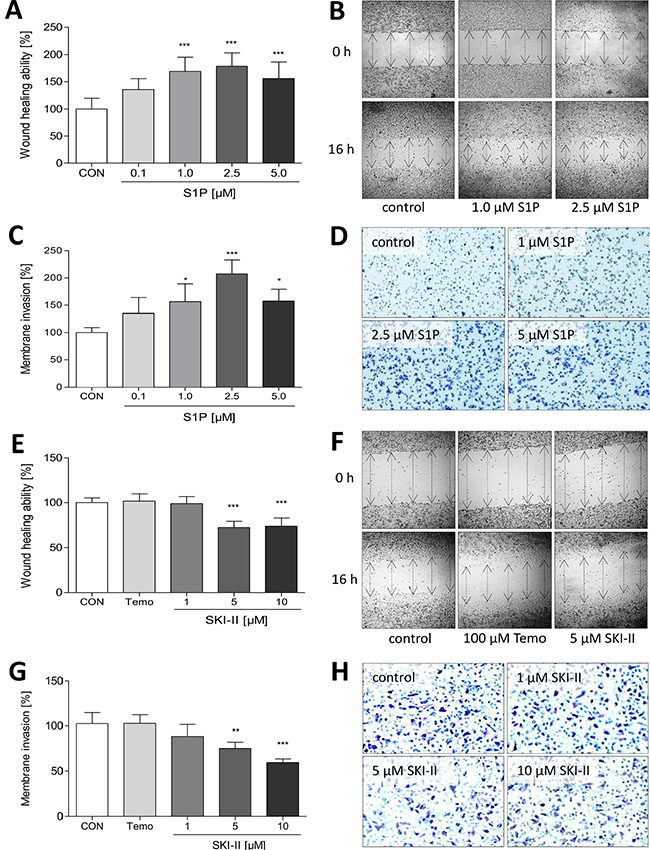 Figure 4: Influence of S1P, temozolomide and SKI-II on migration of LN18 GBM cells. (A + B, E + F) Analysis of LN18 cell migration using the wound closure assay with setting a scratch into the cell layer and measurement of the wound width at the beginning of the experiment (0 h) and 16 h after treatment with S1P (A + B; 0.1, 1, 2.5 and 5 μM) and temozolomide (E + F; Temo, 100 μM) or SKI-II (E + F; 1, 5 and 10 μM). (A + E) Wound closure ability is shown in relation to the control (CON, 100%), mean values and SD, n = 3, One-way analysis of variance with Dunnett´s multiple comparison test, ***p < 0.001 vs. control. (B + F) Representative images of the wound width at 0 h and 16 h, the wound width is marked by arrows. (C + D, G + H) Analysis of LN18 cell migration using the Boyden chamber assay. Cells were treated for 3 h with (C + D) S1P (0.1, 1, 2.5 and 5 μM) and (G + H) temozolomide (Temo, 100 μM) or SKI-II (1, 5 and 10 μM), fixed on the lower side of the membrane, stained with crystal violet and counted. (C + G) Counted cells are shown in relation to the control (CON, 100%), mean values and SD, n = 3, One-way analysis of variance with Dunnett´s multiple comparison test, ***p < 0.001 vs. control. (D + H) Representative images of the migrated and stained cells after 3 h of stimulation.