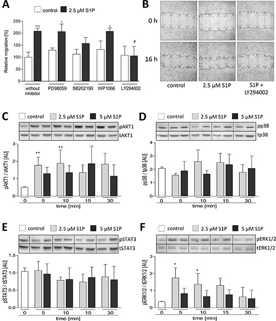 Figure 6: Association between signaling pathways and S1P induced migration of LN18 GBM cells. (A + B) Analysis of LN18 cell migration using the wound closure assay with setting a scratch into the cell layer and measurement of the wound width at the beginning of the experiment (0 h) and 16 h after treatment with DMSO (solvent), 10 μM PD98059, 10 μM SB202190, 10 μM WP1066 or 10 μM LY294002 either in combination with MeOH (control) or 2.5 μM S1P. Cells were pre-treated for 1.5 h with PD98059, SB202190, WP1066, LY294002 or DMSO before adding S1P. (A) Wound closure ability is shown in relation to the control (100%), mean values and SD, n = 3, One-way analysis of variance with Dunnett´s multiple comparison test, *p < 0.05 and ***p < 0.001 vs. control, #p < 0.05 vs. S1P alone. (B) Representative images of the wound width at 0 and 16 h, the wound width is marked by arrows. (C–F) Immunoblot analysis of the phosphorylated (p) and total (t) signaling molecules AKT1 (C), p38 (D), STAT3 (E) and ERK1/2 (F). LN18 GBM cells were treated with 2.5 or 5 μM S1P for 5, 10, 15 and 30 min. Representative blots of four independent experiments each. Densitometric analyses of four independent experiments, phosphorylated protein level (p) was normalized to the total protein level (t), mean values and SD. *p < 0.05 and **p < 0.005 vs. control.