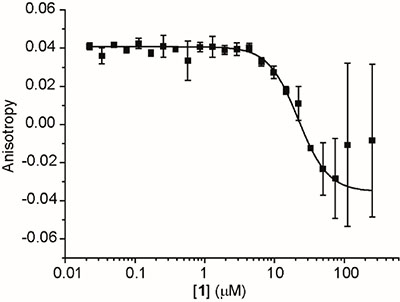 Figure 2: FA titration data of 1. 1 was incubated with 150 nM hDM217–126 recombinant fragment and 50 nM fluorescein-labelled p53 peptide (p5315–31Flu), and fluorescence anisotropy was measured at 480ex/535em.