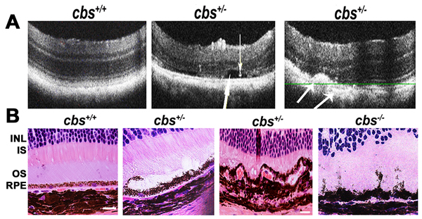 Figure 1: Optical Coherence Tomography (OCT) and histological assessment. A. OCT examination of cbs+/+ and cbs+/-mice (24weeks). b-scans of cbs+/+ mouse ( left panel) and cbs+/- mouse (middle and right panels). The cbs+/- retina ( middle panel) showed separation (big white arrow) and precipitation (small white arrow) at the RPE-photoreceptor interface, while the cbs+/- retina (right panel) showed thickening at the area of the choroidal blood vessel and decreased the thickness of the photoreceptor layer with accumulations of opaque structureless material with hyporeflective subretinal lucency ( medium size arrows) at the RPE-choroid interface suggesting RPE-choroidal abnormality (n = 8). B. Histological assessment of cbs+/+, cbs-/- and cbs+/- mice with edema, vaculation, irregularity and degeneration of the RPE in the cbs+/-and cbs-/-retinas (Calibration bar is 50 µm and n = 9).