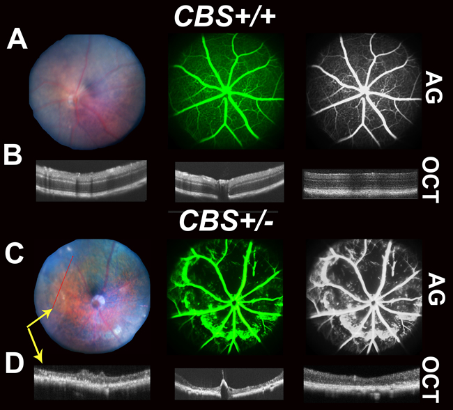 Figure 2: Retinal Fundus examination, Fluorescein angiogram (FA) and Optical Coherence Tomography (OCT) assessment of 64-week cbs+/+ and cbs+/- mice. Fundus examination, FA and OCT were performed on cbs+/+ and cbs+/-mice (64 week). A. and C. Representative fundus and angiograms for cbs+/+ and cbs+/-, showing normal fundus with well-formed vessels in cbs+/+mice; however, fundus and angiograms for cbs+/- mouse retinas exhibit apparent geographic atrophy reflecting retinal loss with severe decrease in the vasculature with diffused hyperfluorescence. The most right panels are black and white images processed using the Adobe Photoshop to permit visualization of vessels. B. and D. OCT examination showing normal appearance of retina in the cbs+/+mice, but reminiscent of geographic atrophy/dry AMD with marked reduction in retina thickness and focal hyper reflective spots in cbs+/- mice, (n = 5 mice). Yellow arrows (C&D) are indicating that images were taken by both FA and OCT simultaneously.