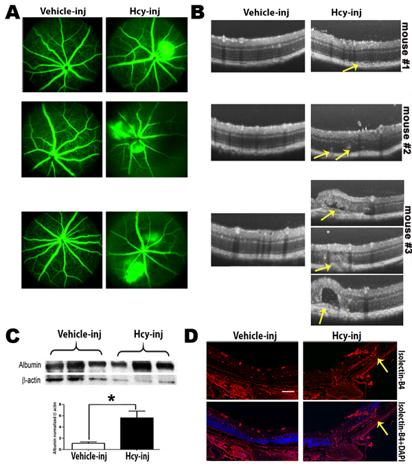 Figure 3: Evaluation of Retinas of C57BL6 mice injected intravitreally with Hcy-thiolactone. A. Fluorescein angiogram evaluation, showing fluorescein leakage with focal areas of hyperfluorescence in Hcy-injected mice compared to normal retinal appearance in vehicle-injected eyes. The leakage was confirmed by measuring the albumin leakage in the retinas by western blotting, which was significantly increased in the Hcy-injected mice eyes, *p < 0.05 C. B. OCT examination revealed features of AMD, such as hyporeflective subretinal lucency (mouse 1&2, yellow arrows), sub retinal fluid and choroidal neovascularization (mouse 3, yellow arrows). D. Choroidal neovascularization were confirmed by staining of the frozen section with blood vessel marker isolectin-B4 (yellow arrows).