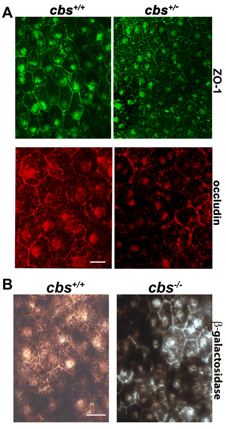 Figure 5: Evaluation of Outer Blood-Retinal Barrier. A. RPE flat-mounts from the cbs+/+and cbs+/- mice (24-30wks) immunostained for markers of tight junction proteins; ZO-1 (green) and occludin (red). B. β-galactosidase activity evaluation, as a biomarker for senescence in RPE flat-mounts. Calibration bar is 10 μm and n = 14.