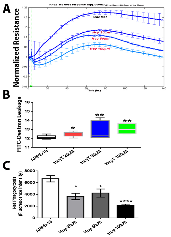 Effect of Hcy-thiolactone on barrier function of RPEs was assessed by recording changes in Trans-Cellular Electrical Resistance (TER) using ECIS as previously described [42,43]. Briefly, 96W20idf arrays were used. These arrays were coated with cysteine for 30 minutes then with gelatin for 30 minutes before seeding the ARPE-19 cells at a density of 104/ well in 300 µL full media. Cells were left undisturbed until fully attached forming a confluent monolayer indicated by a capacitance below 10 nF. Cells were then starved for 6 hours in 200 µL serum free media and treated with different concentrations of Hcy-thiolactone (0, 20, 50, or 100 µM). Different treatments were prepared (3X in serum free media) and added to the corresponding wells in 100 µL without removing the existing media covering the confluent monolayer of ARPE-19. The electric currents, passing through the confluent monolayer, were measured and recorded independently in each well by the ECIS system (Applied Biophysic, Inc., Troy, NY.). TER was measured at frequency of 32000 Hertz and recorded over the experimental time course. TER then normalized as the ratio of measured resistance at each time point to baseline resistance and plotted as a function of time.