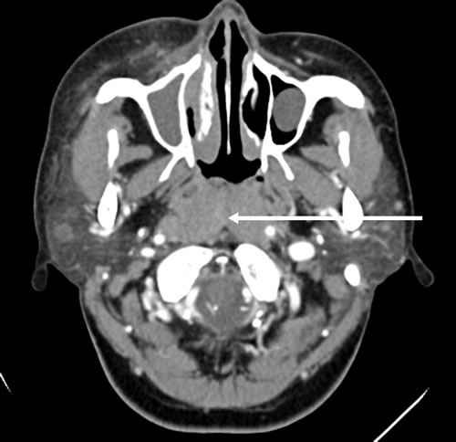 Figure 1: Contrast brain computed tomography shows diffuse swelling of the posterior wall of the pharynx with mild enhancement.
