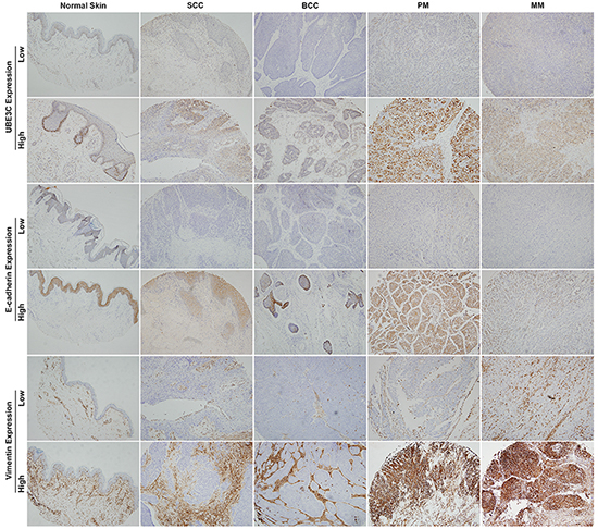 Expression of UBE3C, E-cadherin and vimentin in skin cancer tissues