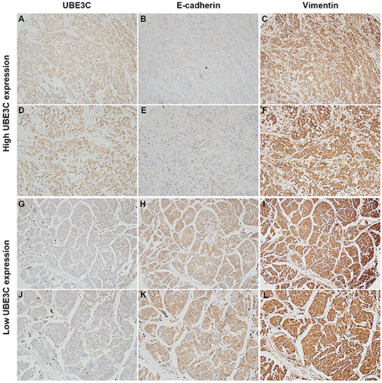 Figure 2: Correlation between UBE3C, E-cadherin and vimentin expression in melanoma tissues. Immunohistochemical analyses indicated that melanoma tissues with high UBE3C expression frequently also had low E-cadherin and high vimentin expression in the same patients. Shown are representative cases with UBE3Chigh/E-cadherinlow/vimentinhigh (A, B, C, 100×; D, E, F, 200×) and UBE3Clow/E-cadherinhigh/vimentinlow (G, H, I, 100×; J, K, L, 200×) expression profiles.