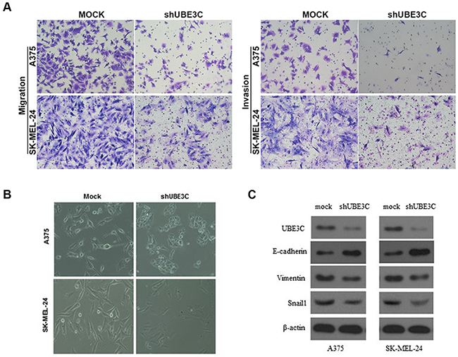 Figure 4: Relationship between UBE3C and melanoma progression. A. UBE3C knockdown significantly inhibited melanoma cell migration and invasion in Matrigel transwell assays. Permeating cells were stained with Giemsa and counted. B. Morphological differences between A375-mock and SK-MEL-24-mock cells and UBE3C-knockdown cells. C. UBE3C knockdown led to up-regulation of E-cadherin and down-regulation of vimentin and Snail1 in melanoma cells.
