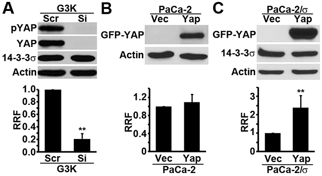 Figure 2: Role of YAP1 in gemcitabine resistance. YAP1 siRNA was transiently transfected into G3K cells A. and GFP-YAP1 cDNA was transiently transfected into MiaPaCa-2 cells B. or MiaPaCa-2 cells with stable 14-3-3σ expression (PaCa-2/σ) C. followed by Western blot analysis of YAP1 expression (upper panels) and survival analysis in the presence of gemcitabine using MTT assay (lower panels). RRF=relative resistance factor. Actin was used as a loading control for Western blot. (n=4, **p<0.01).
