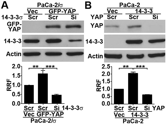 To further investigate if YAP1 requires 14-3-3σ in gemcitabine resistance, we transiently over-expressed GFP-YAP1 in MiaPaCa-2/σ cells followed by knocking down 14-3-3σ and survival assay. As shown in Figure 3A, GFP-YAP1 over-expression significantly increased gemcitabine resistance of MiaPaCa-2/σ cells as expected. However, knocking down 14-3-3σ in MiaPaCa-2/σ cells with GFP-YAP1 over-expression completely eliminated the GFP-YAP1 over-expression-induced increase in gemcitabine resistance. It is noteworthy that the gemcitabine resistance of the 14-3-3σ knockdown cells is significantly lower than the control MiaPaCa-2/σ cells, demonstrating that the basal resistance induced by 14-3-3σ over-expression in MiaPaCa-2/σ cells is reduced by 14-3-3σ knockdown. This observation is consistent with our previous findings demonstrating the role of 14-3-3σ in gemcitabine resistance [8]. Similarly, YAP1 knockdown in MiaPaCa-2/σ cells also eliminated 14-3-3σ-induced gemcitabine resistance (Figure 3B). These findings suggest that YAP1 and 14-3-3σ may depend on each other for their functions in gemcitabine resistance.