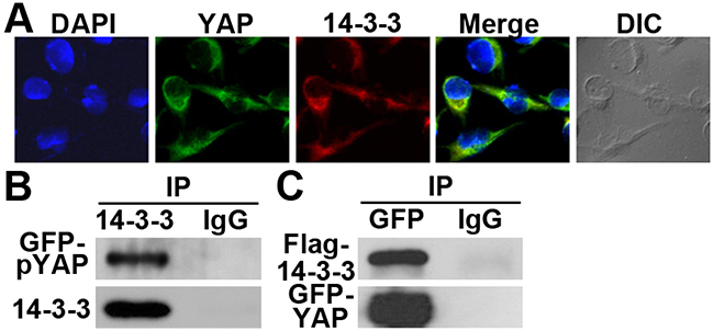 Figure 5: 14-3-3σ co-localization and interaction with YAP1. A. Co-localization of 14-3-3σ and YAP1 in G3K cells viewed using a confocal microscopy. B–C. Co-immunoprecipitation of 14-3-3σ and YAP1 in G3K cells. The ectopic GFP-YAP1 alone (B) or together with Flag-14-3-3σ (C) were over-expressed in G3K cells followed by immunoprecipitation with 14-3-3σ (B) or GFP (C) antibody or control normal IgG and Western blot analysis of pYAP1 or total YAP1 and 14-3-3σ.