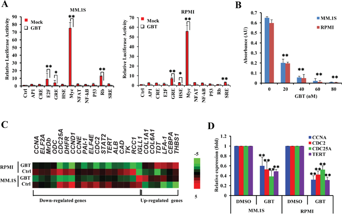 Figure 3: GBT targets c-Myc-mediated transcription. A. Luciferase activity assay of 11 transcriptional factors in the presence of GBT; B. ELISA-based DNA-binding assays to determine the effect of GBT (50 nM) on selective depletion of nuclear c-Myc; C. Heatmap of clustered gene expression data from multiplex experiments (Nanostring) of cancer-associated genes in two human MM cell lines treated with GBT or vehicle control; D. Real-time qPCR showing the expression of genes downstream of c-Myc in MM.1S and RPMI 8226 cells treated with 50 nM of GBT. Data represent mean ± SEM from three independent experiments. Statistical significances at **p<0.005 and *p<0.05 vs. respective vehicle/mock.