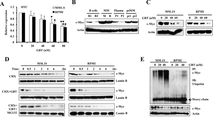 Figure 4: GBT promotes c-Myc degradation. A. qPCR analysis for c-MYC expression in MM cell lines; B. Western blotting analysis showing the dose-dependent effect of GBT on c-Myc protein levels in MM cells; B cells, plasma, and MM cells from patients; C. Accelerated degradation of c-Myc protein after GBT treatment in MM.1S and RPMI8226 cells; D. MM.1S and RPMI8226 cells were treated with 50 nM of GBT, 20 μM of CHX, or the combination of GBT+CHX with 0.5 μM of MG132 for 6 h; E. Immunoprecipitation assay showing enhanced ubiquitination of c-Myc in MM.1S and RPMI8226 cells after GBT treatment. Aliquots from the above groups were directly analyzed by Western blot to test for c-Myc protein (bottom panel) in each group. Data represent mean ± SEM from three independent experiments. Statistical significances at **p<0.005 and *p<0.05 vs. respective vehicle/mock.