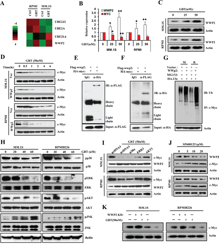 Figure 5: GBT upregulates WWP2 to accelerate c-Myc ubiquitination via JNK cascade. A. Heatmap of selected genes participating in protein processing and proteolysis in two human MM cell lines treated with GBT or vehicle control; B. and C. Real-time qPCR and Western blotting analysis confirm the upregulation of WWP2 in MM.1S and RPMI8226 cells treated with increasing concentrations of GBT; D. Degradation rates of endogenous c-Myc substrates in MM.1S and RPMI8226 cells transfected with pcDNA3-flag-WWP2 in the absence and presence of GBT (50 nM). E. and F. Interaction between WWP2 and c-Myc in vivo. 293T cells were transfected with expression vectors for HA-c-Myc and FLAG-WWP2. Cell lysates were subjected to immunoprecipitation with anti-FLAG or anti-HA, and the resulting precipitates were subjected to immunoblot analysis with anti-HA or anti-FLAG, respectively. A portion of cell lysates corresponding to 5% of the input for immunoprecipitation was also subjected directly to immunoblot analysis. Normal IgG was used as a negative control. G. Promotion of c-Myc ubiquitylation by WWP2. MM.1S and RPMI8226 cells were transfected with expression vectors or FLAG-WWP2 together with HA-tagged ubiquitin. Immunoprecipitation was performed with anti-c-Myc and subsequently immunoblotting analysis was conducted with anti-HA antibodies to detect c-Myc ubiquitylation. H. Effects of GBT on multiple signaling pathways in MM.1S and RPMI8226 cells. Levels of p-AKT/AKT, p-p38/p38, p-ERK/ERK, and p-JNK/JNK in total cell lysates were evaluated by Western blot analysis. β-actin was used as the loading control; I. The rate of degradation of endogenous c-Myc on treatment with GBT in MM.1S cells transfected with p38α, ERK1, or AKT1 plasmids. J. Inhibition of JNK cascade by increasing concentrations of SP600125 antagonized the upregulation of WWP2 and reversed c-Myc degradation. All data are representative of at least three independent experiments. K. c-Myc levels in MM.1S and RPMI8226 cells infected with WWP2-shRNA lentivirus for 48 hr and then treated with or with GBT (50 nM).