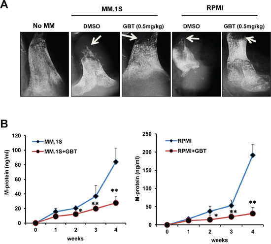 Figure 7: GBT alleviates bone destruction induced by MM cells in a SCID-hu mice model. A. X-ray of the bone resorption induced by MM.1S or RPMI8226 cells in the DMSO control group or GBT group (0.5 mg/kg) in a SCID-hu mice model; B. ELISA assay of the M-protein levels from sera of SCID-hu mice with MM.1S or RPMI8226 cells in the DMSO control group or GBT group (0.5 mg/kg). Data represent mean ± SEM (n=12/group). Statistical significances at **p<0.005 and *p<0.05 vs. respective vehicle-treated group.