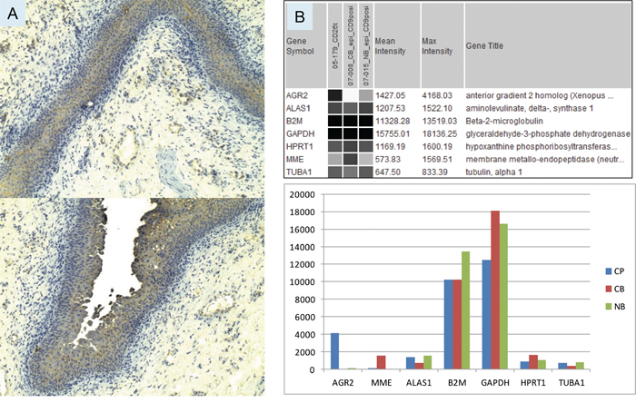 Figure 1: Bladder AGR2 expression. A. The urothelial cells in specimen 03-043B1 are stained at moderate intensity (compared with that in prostate cancer cells) by anti-AGR2. Two different parts of the tissue specimen show uniform expression likely throughout the urothelium. Magnification is 100x. B. Transcriptome dataset query display compares the expression levels of AGR2 and reference genes in sorted populations of prostate cancer cells (05-179_CD26t), bladder cancer cells (07-008_CB_epi_CD9posi), and normal bladder cells (07-015_NB_epi_CD9posi). The same data is shown below in a histogram format – CP = prostate cancer; CB = bladder cancer; NB = normal bladder. Probeset intensity values are on the y-axis.