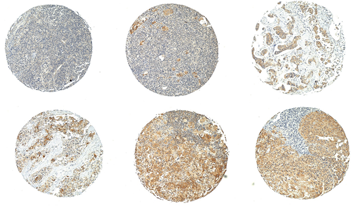 Figure 2: AGR2 in primary bladder cancer. Shown are TMA examples of tumor immunostaining for AGR2. Positive cells are in brown.