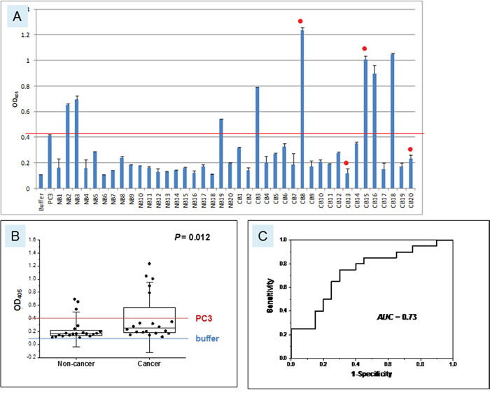 Figure 5: Urinary AGR2 levels in bladder cancer patients. A. The x-axis and y-axis are the same as those in Figure 4. Samples labeled NB are non-cancer (n = 20), CB are cancer (n = 20). The red line marks the level of positive control PC3 and the blue line the level of negative buffer control. Red dots indicate cases with recurrence. B. The boxplot is shown with the 25 and 75 percentile values and the medians, 1.5xSD values in whiskers. P = 0.012. C. Shown is the AUC = 0.73.