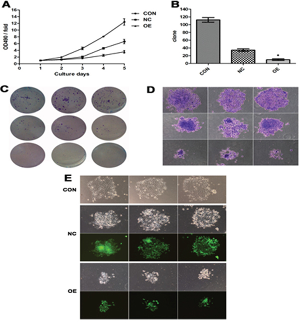 Figure 3: Increased expression of AB209630 suppressed the proliferation of FaDu cells. A. The proliferation assay was performed on parental (CON), lentiviral vector control (NC), and overexpression lncRNA-AB209630 (OE) FaDU cells. The absorbance was measured on days 1, 2, 3, 4, and 5 according to the MTT method. B. The Gimsa-stained colonies were observed and measured under a microscope (×200). A bar graph shows the differences in colony formation among the three groups. The data are presented as the mean ± SD for three independent experiments (*P <0.01, compared with NC). C. Colonies were photographed. D. The diameter of OE sarcospheres was much smaller than that of CON and NC sarcospheres. E. Sarcospheres were photographed under a fluorescent microscope (×200).