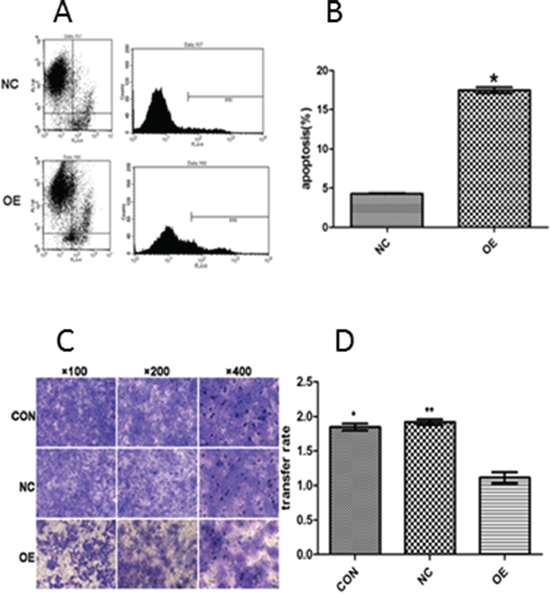 Figure 4: The apoptosis rate was evaluated quantitatively by flow cytometry (A and B) and the suppressive effect of AB209630 on the invasion of FaDu cells (C and D). A. The figure shows a representative result; B. The comparison of apoptosis rates between NC and OE cells. The data are presented as the mean ± SD for three independent experiments (*P <0.01); C. Transwell invasion assay showed that increased AB209630 expression inhibited cell invasion of FaDu cells. The Gimsa-stained photographs were observed and measured under a microscope (×100, ×200, and ×400). Representative of three experiments; and D. Graphical representation of the rates of invading FaDu cells in the three groups. Data are shown as mean ± SD from three experiments (*P <0.05, CON versus OE; **P <0.05, NC versus OE).