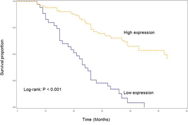 Among 138 patients with HSCC, the median follow-up period for these patients was 33 months (range, 7-53 months). Of these patients, a total of 78 patients died, mainly owing to disease recurrence and second primary malignancy followed in frequency by death from causes unrelated to cancer. As shown in Figure 5, the difference in OS between HSCC patients with high and low expression of AB209630 was statistically significant (log-rank: P < 0.001). The HSCC patients with increased expression of AB209630 had significantly better OS than those with decreased expression of AB209630. Multivariable analysis showed that patients with increased expression of AB209630 had significantly reduced risk of death overall compared to those with decreased expression of AB209630 (HR, 0.25; 95% CI, 0.15-0.42) (Table 1).