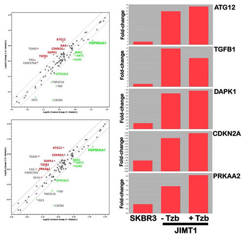 Figure 1: Analysis of autophagy genes in trastuzumab-refractory breast cancer cells. Left. Total RNA from trastuzumab-sensitive SKBR3 and trastuzumab-refractory JIMT-1 cells was characterized in technical triplicates using the Autophagy RT2 Profiler PCR Array as per the manufacturer’s instructions (SABiosciences; http://www.sabiosciences.com/rt_pcr_product/HTML/PAHS-084A.html). Representative scatter plots of the difference (≥ 2-fold; green and red symbols indicate downregulation and upregulation vs. expression levels in SKBR3 cells, respectively) in relative transcript abundance of 84 key genes involved in autophagy are shown. Grey symbols denote the fold-change results to be validated with a sufficient number of biological replicates [i.e., fold-change results may have greater variations if the p-value > 0.05, or the p-value for the fold-change is either unavailable or relatively high (p > 0.05)] or that are uninterpretable because the gene’s average threshold cycles were either not determined or were greater than the defined cut-off value (default 35) in both samples. Total. The transcript abundance of selected autophagy-related genes were calculated using the delta Ct method and presented as fold-change vs. basal expression in trastuzumab-sensitive SKBR3 cells.