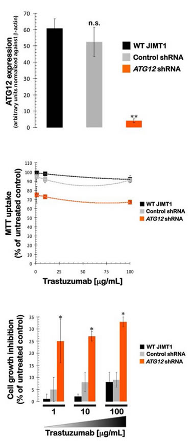 Figure 3: Impact of shRNA-driven genetic ablation of ATG12 on the efficacy of the anti-HER2 monoclonal antibody trastuzumab (Herceptin) in vitro. The metabolic status of JIMT1 parental cells, control shRNA-JIMT1 cells, and ATG12 shRNA-JIMT1 cells treated with graded concentrations trastuzumab was evaluated using MTT-based cell viability assays, followed by the generation of dose-response graphs depicting the % of untreated cells (untreated control cells = 100% cell viability). The results are presented as the means (columns) and 95% confidence intervals (bars) of three independent experiments performed in triplicate. [n.s. not significant; * P < 0.05]