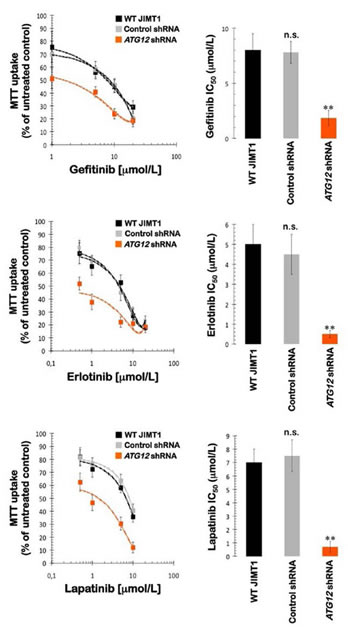 Figure 4: Impact of shRNA-driven genetic ablation of ATG12 on the efficacy of HER1/2-tyrosine kinase inhibitors in vitro. Left panels. The metabolic status of JIMT1 parental cells, control shRNA-JIMT1 cells, and ATG12 shRNA-JIMT1 cells treated with graded concentrations of erlotinib, gefitinib, and lapatinib was evaluated using MTT-based cell viability assays, followed by the generation of dose-response graphs depicting the % of untreated cells (untreated control cells = 100% cell viability). The results are presented as the means (columns) and 95% confidence intervals (bars) of three independent experiments performed in triplicate. Right panels. The degree of sensitivity of JIMT1 parental cells, control shRNA-JIMT1 cells, and ATG12 shRNA-JIMT1 cells to HER1/2-targeting drugs is illustrated by bars representing mean IC50 values in each cell line. Error bars show standard deviations. [n.s. not significant; ** P < 0.005]