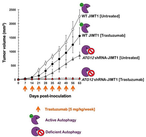 Figure 5: Impact of shRNA-driven genetic ablation of ATG12 on the efficacy of trastuzumab in vivo. Shown are the mean tumor volumes (±SD) in JIMT1 and ATG12 shRNA-JIMT1 xenograft-bearing nude mice following injection with trastuzumab (5 mg/kg/week) for nine weeks. Data from control shRNA-JIMT1 cells were superimposable with those obtained in JIMT1 parental cells and have been omitted for simplicity.