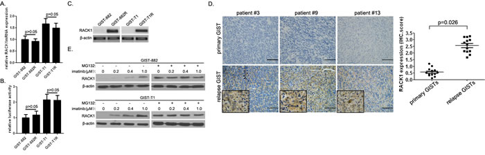Figure 1: RACK1 is overexpressed in imatinib-resistant GIST cells. A. RACK1 mRNA expression in GIST-882R, GIST-T1R, and parental imatinib-sensitive cells was assessed by real-time PCR. B. Relative promoter activity of pGL3-GNB2L1-luc in GIST-882R, GIST-T1R, and parental imatinib-sensitive cells. C. RACK1 protein levels in GIST-882R, GIST-T1R, and parental imatinib-sensitive cells assessed by Western blots. D. Immunohistochemical analysis of RACK1 in tumor sections taken from representative GIST patients before (primary tumors) and after (relapse tumors) imatinib treatment (left panels). Scale bars: 50 μm. RACK1 expression in relapse GISTs after imatinib treatment was compared to matched primary tumors (right panel; n = 12). E. RACK1 protein levels in imatinib-resistant sublines of GIST-882 and GIST-T1 cells with or without MG132 treatment were determined by immunoblotting. β-actin was used as an internal control. Bars represent the mean of triplicate samples; error bars represent standard deviation. Data are representative of three independent experiments.