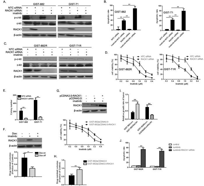 Figure 2: RACK1 modulates imatinib resistance. A. After GIST-882 and GIST-T1 cells were treated with imatinib and/or RACK1 siRNA for 72h, p-KIT, total KIT, and RACK1 protein levels were determined by Western blot. B. The apoptotic rate was assessed by flow cytometry of Annexin V-FITC/PI staining (lower panel). C. After GIST-882 and GIST-T1 cells were treated with imatinib and/or RACK1 siRNA, p-KIT, total KIT, and RACK1 protein levels were determined by Western blot. D. Cell viability was assessed using Cell Titer-Glo assays. E. GIST-882 and GIST-T1 cells were transfected with either NTC siRNA or RACK1 siRNAs for 48 hr followed by imatinib (1μM) for 4 weeks. The number of imatinib-resistant colonies formed was quantified. F. Doxycycline-inducible shRACK1-expressing cells were established from GIST-T1 cells. RACK1 expression was detected by Western blot (upper panel). The transfectants were treated with imatinib (1μM) for 4 weeks with or without doxycycline to assess drug-resistant colony formation. The fraction of control colonies that developed imatinib resistance was quantified (lower panel). G. Generation of GIST-882 cells stably expressing pCDNA3.0 or pCDNA3.0-RACK1. RACK1 expression was detected by Western blot (upper panel). The transfectants were treated with imatinib for 72 hr to measure cell viability using Cell Titer-Glo assays (lower panel). H. The transfectants in (E) were treated with imatinib (1μM) for 4 weeks to measure drug-resistant colony formation. The fraction of control colonies that developed imatinib resistance was quantified. I. After in vivo imatinib treatment for 21 days, implanted tumor length and width were measured and relative growth rate was determined. J. GIST-882R and GIST-T1R cells were treated with 10 µM sunitinib either alone or in combination with RACK1 siRNA for 72 hours, after which the apoptotic rate was assessed by flow cytometry of Annexin V-FITC/PI staining. Bars represent the mean of triplicate samples; error bars represent standard deviation. Data are representative of three independent experiments. **p < 0.05 versus corresponding controls.