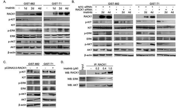 Figure 4: RACK1 reactivates the ERK and Akt pathways during induction of imatinib resistance in GIST cells. A. GIST-882 and GIST-T1 cells were harvested after imatinib treatment for the indicated times, and whole cell lysates were analyzed by Western blotting for RACK1, p-c-KIT, total c-KIT, p-ERK, total ERK, p-AKT, and total AKT. B. GIST-T1 and GIST-882 cells were transfected with control or RACK1 siRNAs. Transfected cells were cultured for 72 hours and harvested after imatinib treatment for 2 or 4 days. Whole cell lysates were subjected to Western blot to determine the protein levels of RACK1, p-c-KIT, total c-KIT, p-ERK, total ERK, p-AKT, and total AKT. C. GIST-T1 and GIST-882 cells were transfected with pcDNA3.0/RACK1 or control vector, after which whole cell lysates were analyzed by Western blotting for p-c-KIT, total c-KIT, p-ERK, total ERK, p-AKT, and total AKT. D. Cell lysates from imatinib-resistant sublines of GIST-882 cells were subjected to immunoprecipitation with anti-RACK1 antibody, followed by Western blot with related antibodies as indicated.