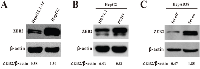 Figure 1: The expression of ZEB2 in HBV-expressing cells. A. Expression of ZEB2 in HepG2.2.15 and HepG2 cells was analyzed using western blot. β-actin was used as a loading control. ZEB2/β-actin ratios were quantified by densitometric analysis with Quantity One software (Bio-Rad). Results presented were representative of 3 independent experiments. B. Expression of ZEB2 in HepG2 cells transiently transfected with plasmid pCH-9/3091 or vector pCH9 was analyzed using western blot. β-actin was used as a loading control. The ZEB2/β-actin ratio was quantified. C. Expression of ZEB2 in HepAD38 cells. Cells were cultured in medium with 0.3 μg/ml of tetracycline (Tet on: no HBV replication) and without tetracycline (Tet off: HBV replication).