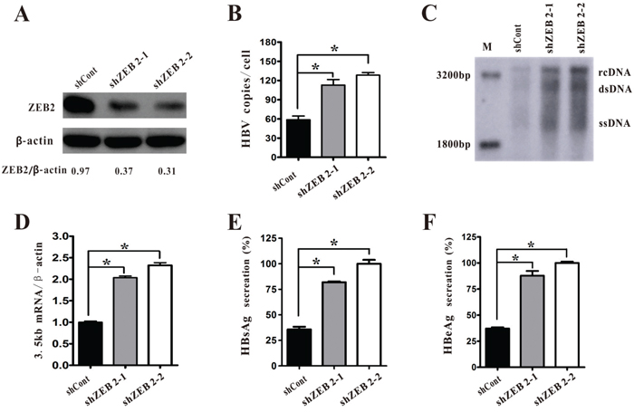 Figure 3: ZEB2 silencing promoted HBV replication in HepG2.2.15 cells. A. HepG2.2.15 cells were infected with lentiviruses expressing shCont or ZEB2-targeting shZEB2-1 and shZEB2-2. Western blot analysis of ZEB2 was used to confirm the silencing efficiency, and ZEB2/β-actin ratios were quantified. B-C. HBV DNA replicative intermediates were determined in ZEB2 knockdown cells using real-time PCR (B) and southern blot analysis (C) (* p < 0.01). D. HBV 3.5kb RNA in HepG2 cells was analyzed by real-time PCR. E-F. HBsAg and HBeAg secreted in the supernatant were analyzed by ELISA assay. O.D. values were expressed as a percentage relative to the shZEB2-2. All results shown as the means ± SD (* p < 0.01).