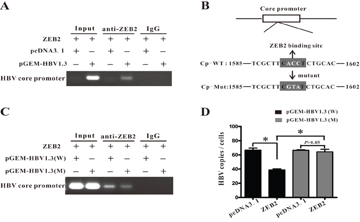 Figure 5: ZEB2 regulated HBV replication by interacting with HBV core promoter. A. ChIP assay was performed to confirm the interaction between ZEB2 and HBV core promoter. Plasmid ZEB2 was co-transfected with pGEM-HBV1.3 into Huh7 cells. IgG of mouse was used as the control group. Input: The sample of DNA from total cell extract. B. The ZEB2 binding site (5′-CACCT-3′) was found in the HBV core promoter region. Point mutation of the binding site is in white (ACC→GTA). Cp-WT: the sequence of wild type HBV core promoter. Cp-Mut: the sequence of mutant ZEB2-binding site on HBV core promoter. C. Mutation of ZEB2 binding site decreased binding activity of ZEB2 to HBV core promoter. HepG2 cells were co-transfected with vector expressing ZEB2 and plasmid pGEM-HBV1.3 or pGEM-HBV1.3 mut (containing mutated ZEB2 binding site). ChIP assay was conducted 3 days after transfection. D. Mutated ZEB2 binding site eradicated ZEB2-induced inhibition of HBV replication. HepG2 cells were co-transfected with vector expressing ZEB2 and plasmid pGEM-HBV1.3 or pGEM-HBV1.3 mut. Effect of ZEB2 on HBV replication was analyzed by real-time PCR (* p < 0.01).