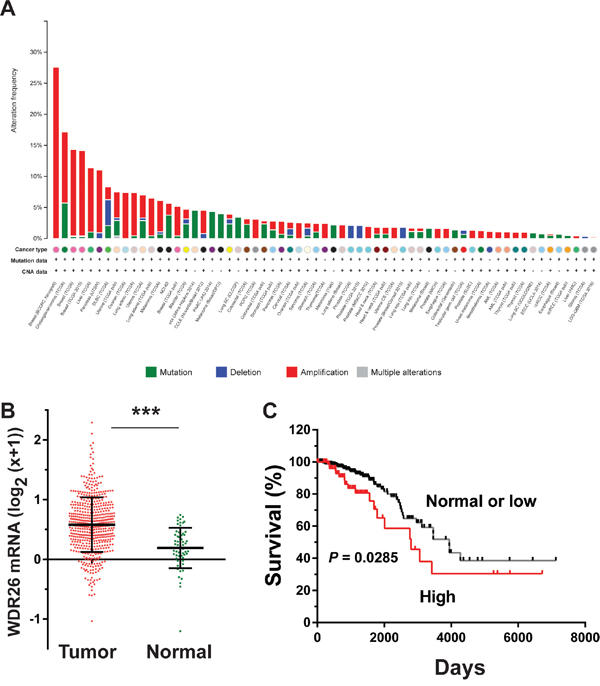 Figure 1: WDR26 expression is upregulated in breast cancer and correlated with poor patient survival. A. breast cancer contains the highest frequency of WDR26 gene amplification. WDR26 genomic DNA copy-number variation across all tumor samples from 121 cancer studies was analyzed by cBioportal. B. WDR26 expression in TCGA invasive breast cancer dataset (n=63 for normal and n=534 for invasive cancer). *** p<0.0001. C. Kaplan-Meier curve shows the overall survival between samples overexpressing WDR26 (n=89) and samples expressing normal or low levels of WDR26 (n=368).