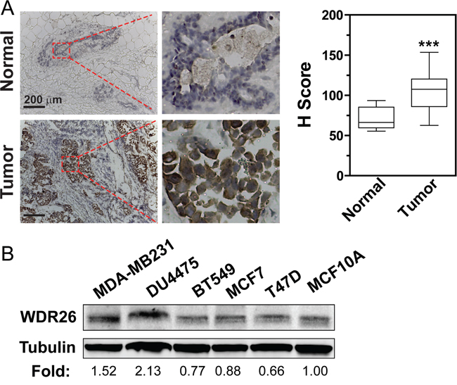 Figure 2: WDR26 is overexpressed in cell lines and tissue samples of human breast cancer. A. WDR26 expression is significantly increased in malignant human breast cancer samples, as compared to normal breast tissues. Representative images show immunohistochemical staining of WDR26 protein in human breast cancer samples (Stage III) and matched, adjacent, normal tissues. Quantitative data are shown on the right. *** p<0.001 (n=15). B. Western blot analysis of WDR26 expression in human breast cancer cell lines. The relative level of WDR26 expression is expressed as a fold change over that in MCF10A (after normalization by tubulin) and indicated underneath the blot (n=3).