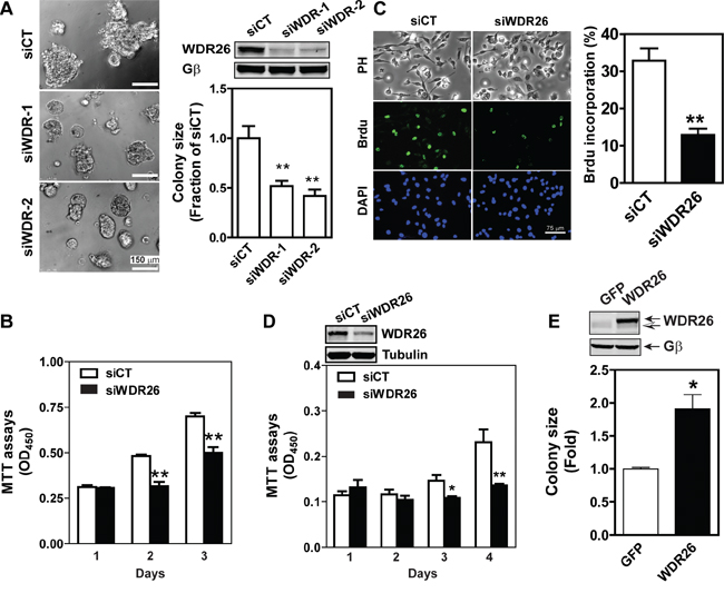 Figure 3: WDR26 promotes proliferation of breast cancer cells. A-D. Downregulation of WDR26 inhibited breast cancer cell growth. MDA-MB231 (A-C) or DU4475 (D) cells were transiently transfected with a control (siCT) siRNA or siRNAs targeting two distinct regions of WDR26 (siWDR-1 and siWDR-2) (A) or siWDR-1 (siWDR26) (B-D). The effect on cell growth in Matrigel (A) was determined by phase-contrast imaging, followed by quantification of the size of the colonies. Colony size is expressed as the fraction of that derived from siCT-transfected cells. The effect on cell growth in 2D culture was measured by MTT assays (B and D) or BrdU incorporation assays (C). BrdU incorporation was detected by immunofluorescence staining. Phase contrast (PH) images of cells and fluorescence images of BrdU and nuclear (DAPI) staining are shown in (C) Quantitative data showing the level of BrdU incorporation are expressed as the percentage of cells stained with BrdU. *, ** p<0.05 and 0.01 versus siCT, respectively (n=5). Insert, representative blots showing WDR26 downregulation. E. overexpression of WDR26 promotes MCF7 cell growth. MCF7 cells stably expressing inducible GFP or WDR26 were treated with doxycycline (1 μg/ml) and cultured in Matrigel for ten days. The size of cell colonies was quantified and expressed as a fold-increase over that of GFP-expressing colonies. * p<0.05 versus GFP (n=4). Insert, a representative blot showing the level of WDR26 overexpression. Solid and hollow arrows indicate the ectopic and endogenous WDR26 expression in MCF7 cells, respectively.