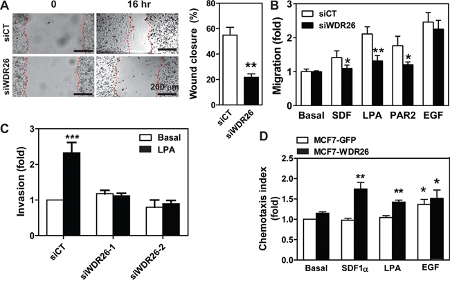 Figure 4: WDR26 promotes breast cancer cell migration and invasion. A-C. MDA-MB231 cells were transiently transfected with a control siRNA (siCT) or siRNAs against WDR26 (siWDR26, siWDR26-1 or siWDR26-2). The effects on cell migration were determined by a wound healing assay (A) and transwell migration assay (B) in response to buffer (basal) or chemoattractants, SDF1α (100 nM), LPA (50 nM), PAR2 agonist peptide (10 μM) and EGF (50 ng/ml). The effect of LPA on cell invasion was determined in a transwell migration assay with the filter coated with a thin layer of Matrigel (C). *, **, *** p<0.05, 0.01 and 0.001, respectively, versus siCT (n=4). D. the effect of WDR26 overexpression on MCF7 cell migration. MCF7 cells stably expressing inducible GFP or WDR26 were treated with doxycycline (1 μg/ml) for 5 days and then subjected to the transwell migration assay as described in B. *, ** p<0.05 and 0.01, respectively, versus basal (n=4).